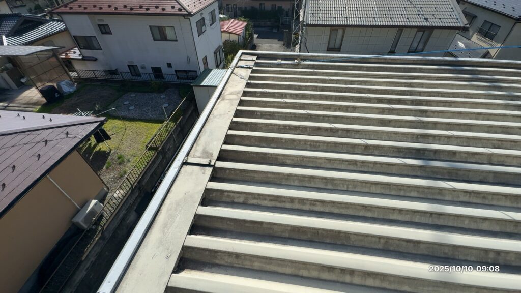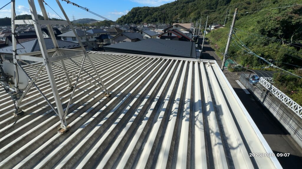屋根もガルバリウム鋼板で塗膜の光沢が薄れ、細部には錆の初期症状も。