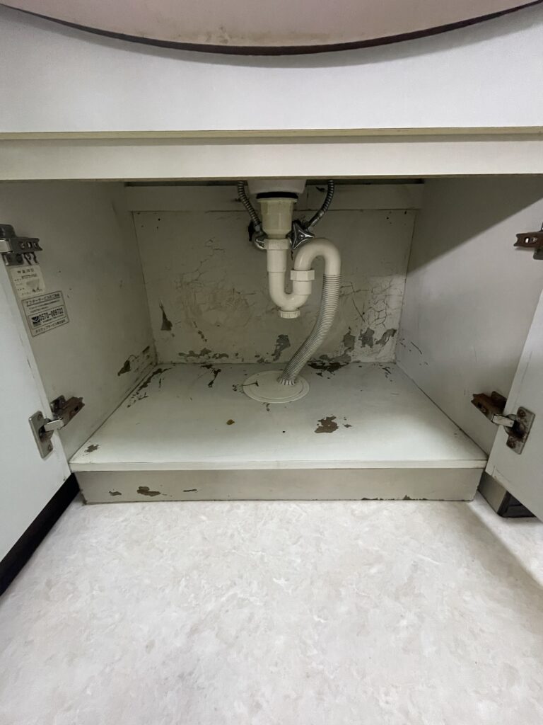 洗面台の排水部分からの水漏れが原因で、以下のような被害が発生しているのがわかります: