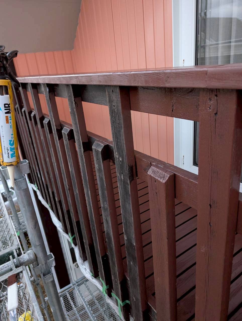 ベランダの木部部分の塗膜が剥がれ、腐食も進んでおり、塗り替え工事を行いました。