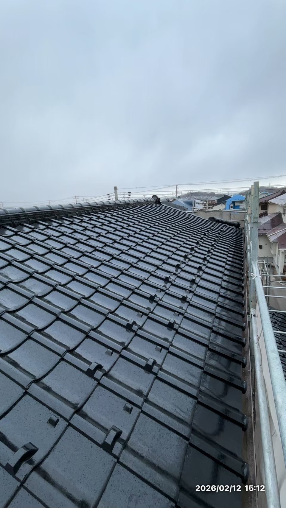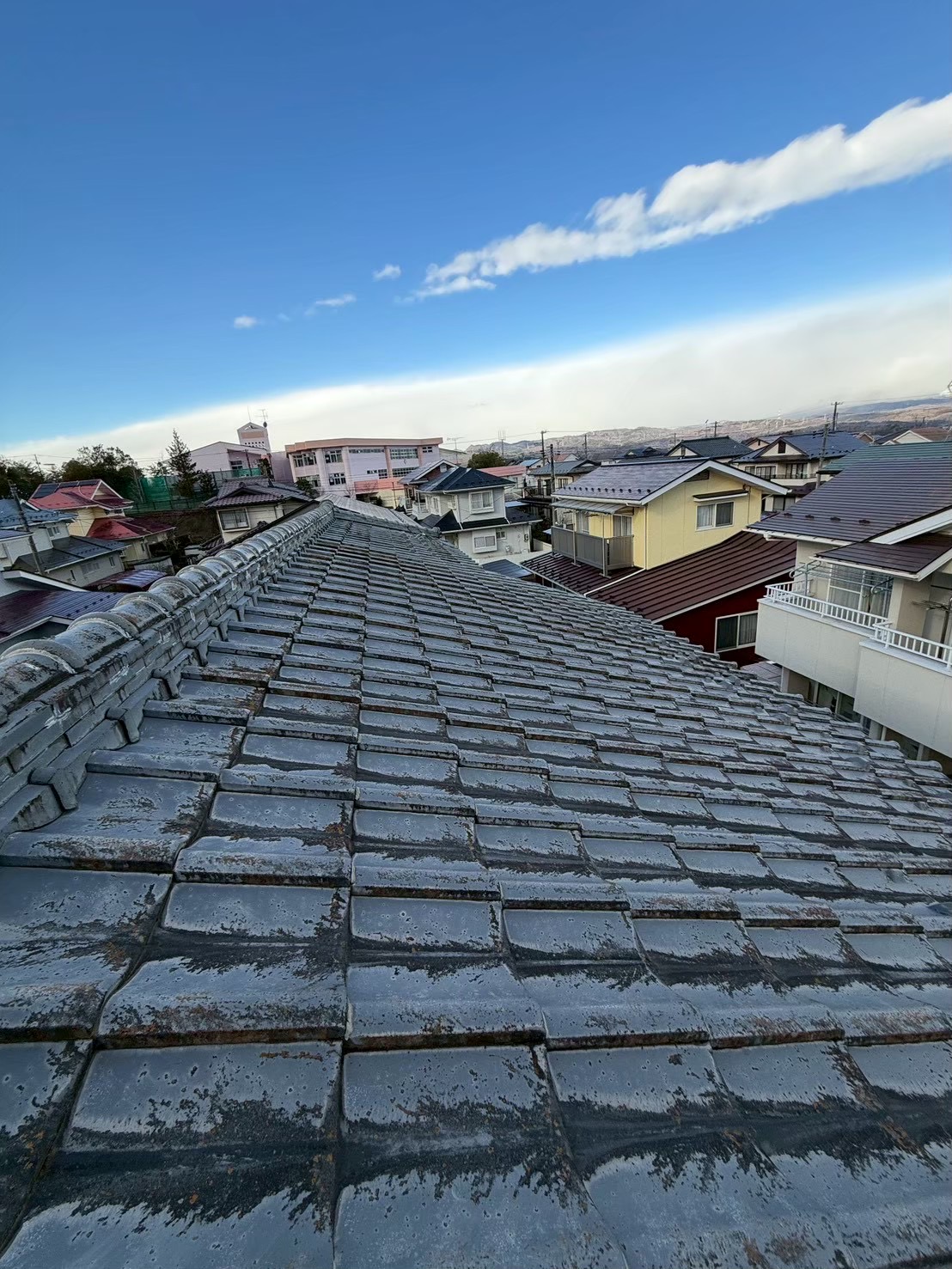 セメント瓦の塗膜が抜け落ちており、部分的にひび割れなども出てきており、補修を行い高圧洗浄機を用いて汚れを丁寧に洗い流し、塗装を施しました。塗料の密着性を高めるために専用のプライマーを塗布し、中塗り・上塗りと3回塗りにて仕上げを行いました。