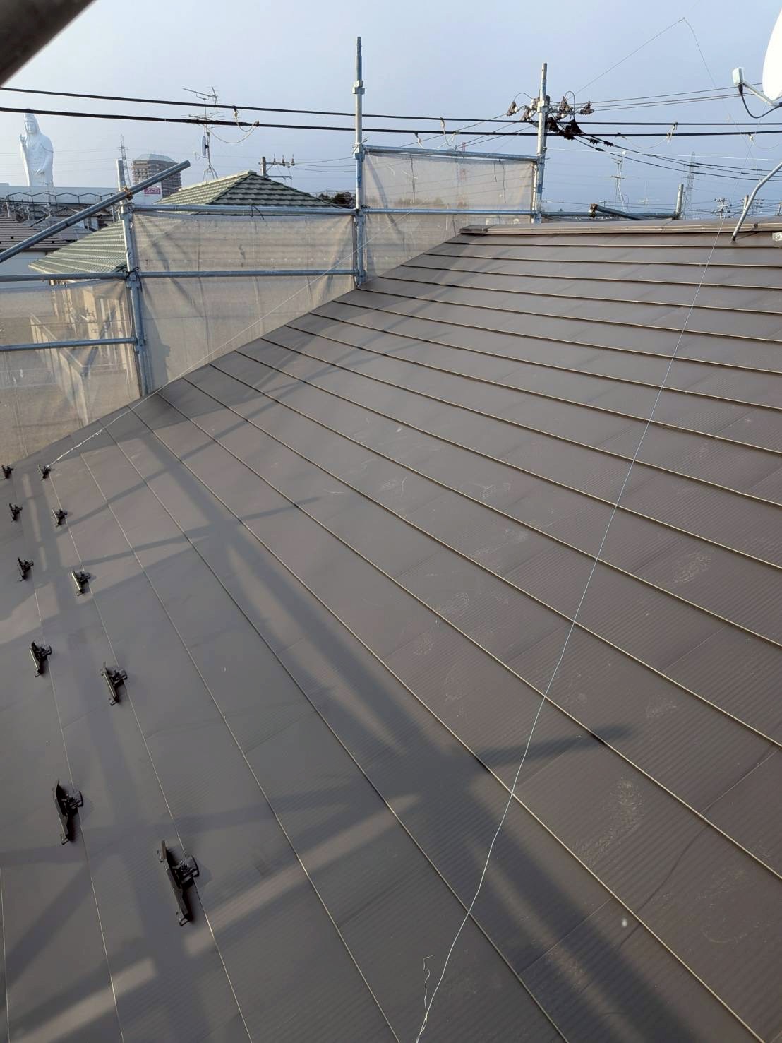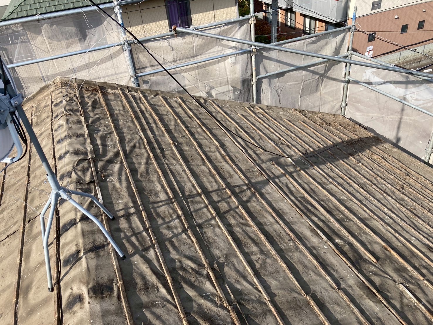 今回の工事では、既存の瓦屋根をすべて撤去し、軽量で耐震性に優れたガルバリウム鋼板屋根へ葺き替えを実施。